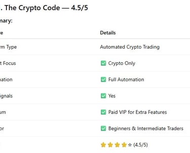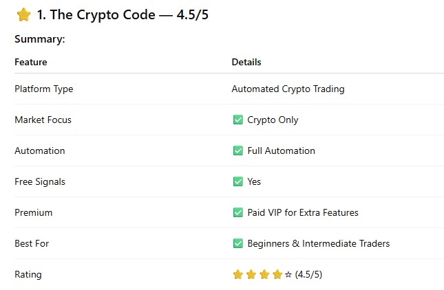 Crypto Code stands out for offering more than just signals. The platform combines automation, community support, and educational resources.