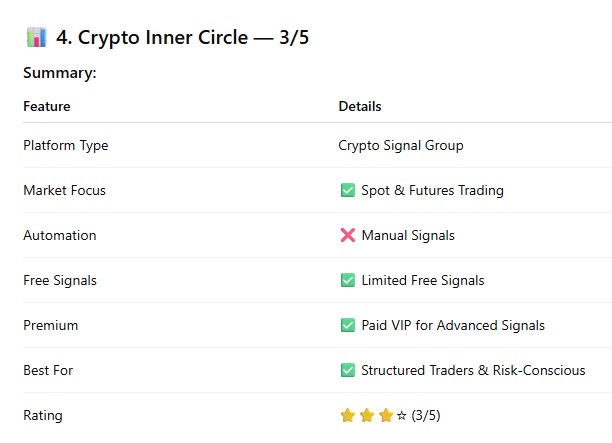 Crypto Inner Circle is best suited for traders who prefer methodical trading strategies rather than high-frequency signals.