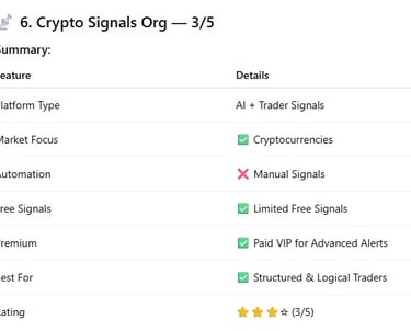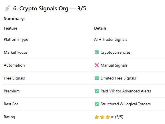 Crypto Signals Org blends AI-assisted and human-generated signals with educational support and risk management.